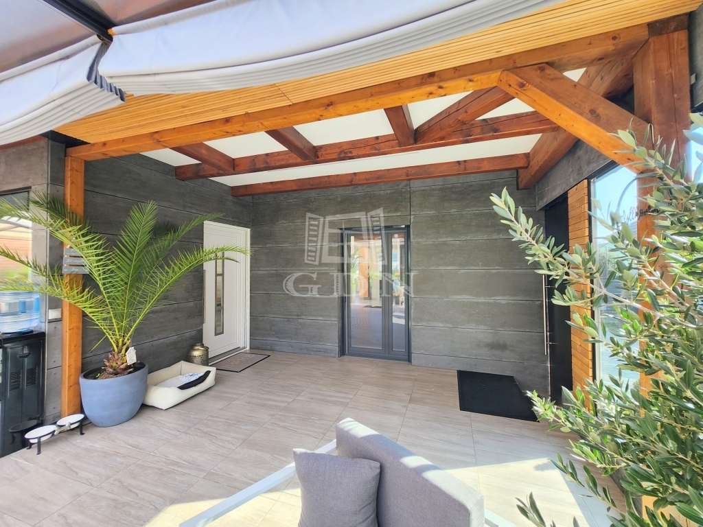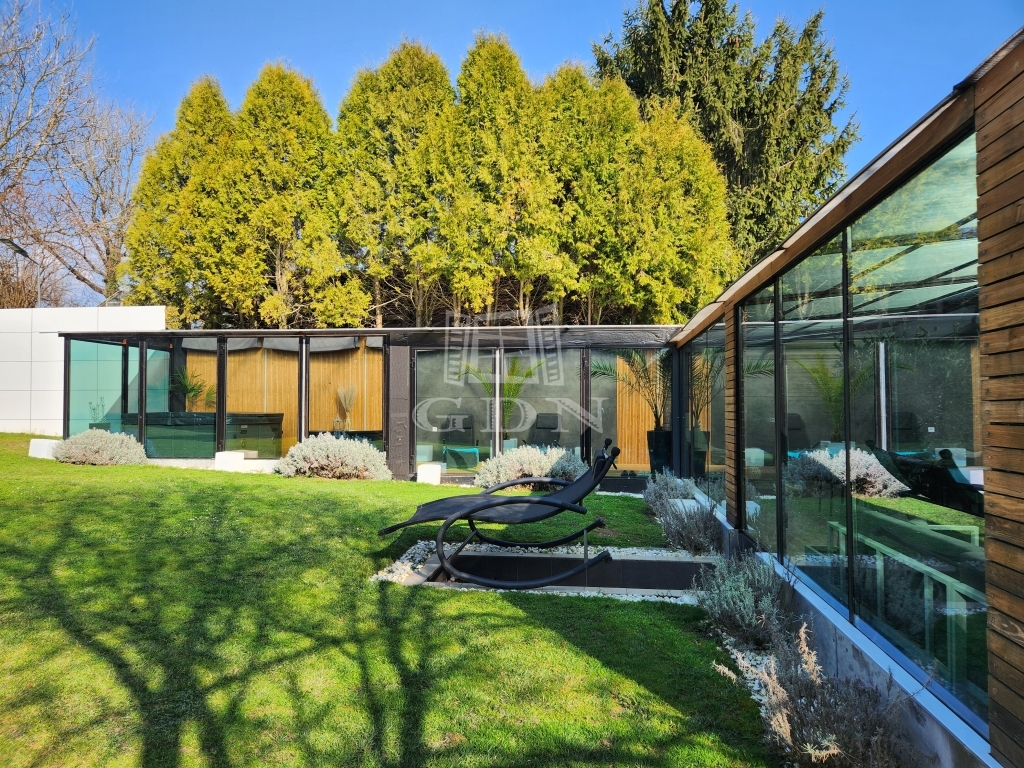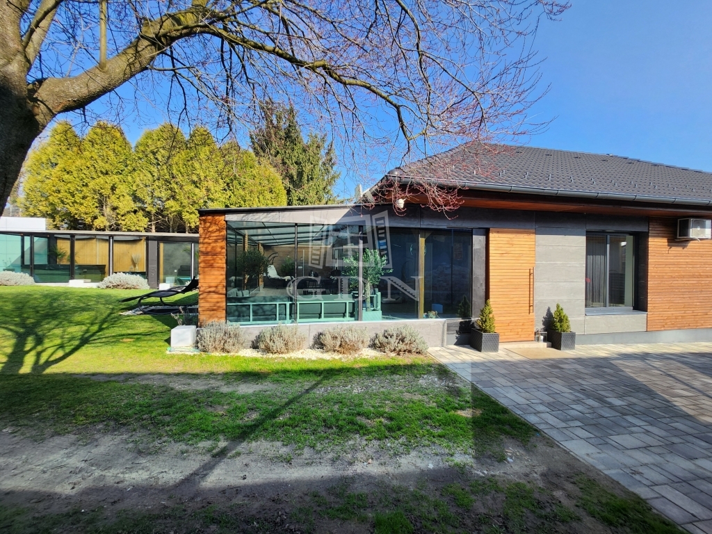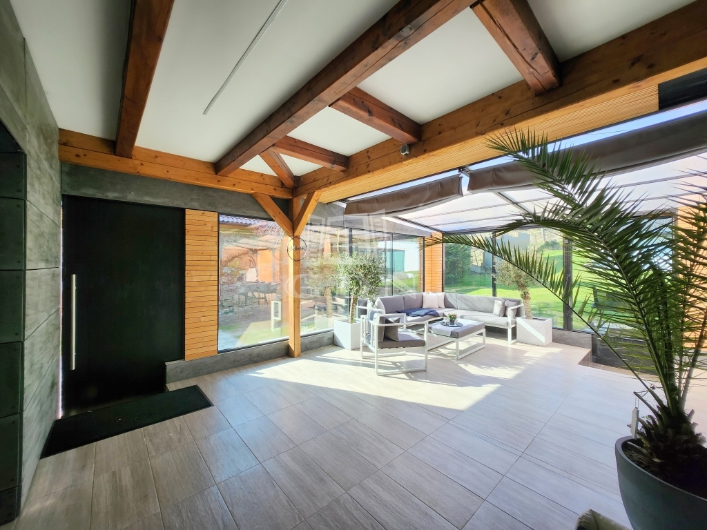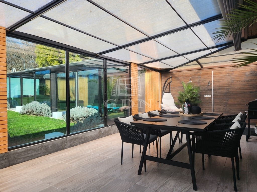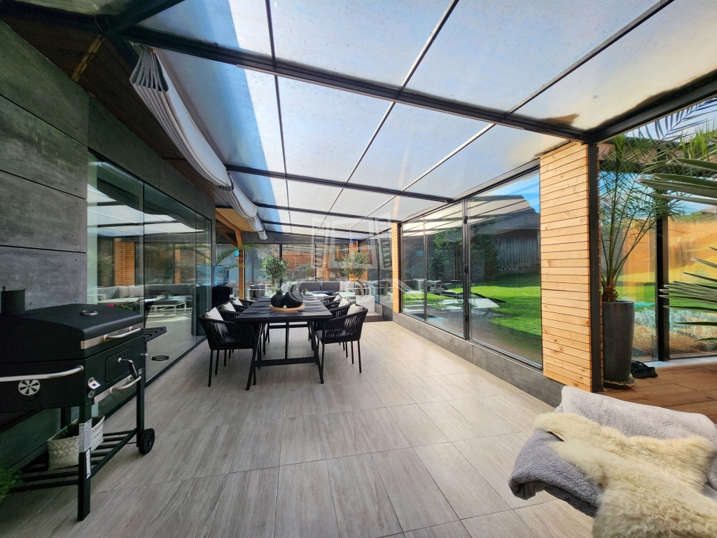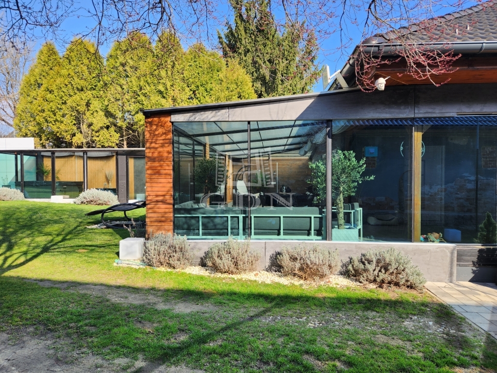 Csendes, árnyékolókkal ellátott 80 m2-es terasza pihenésre, családi összejövetelekre, kikapcsolódásra " született". Óriás üvegfelületei, kertre néző kilátása és a nyugalom, amely árad belőle, páratlan érzést képes nyújtani!