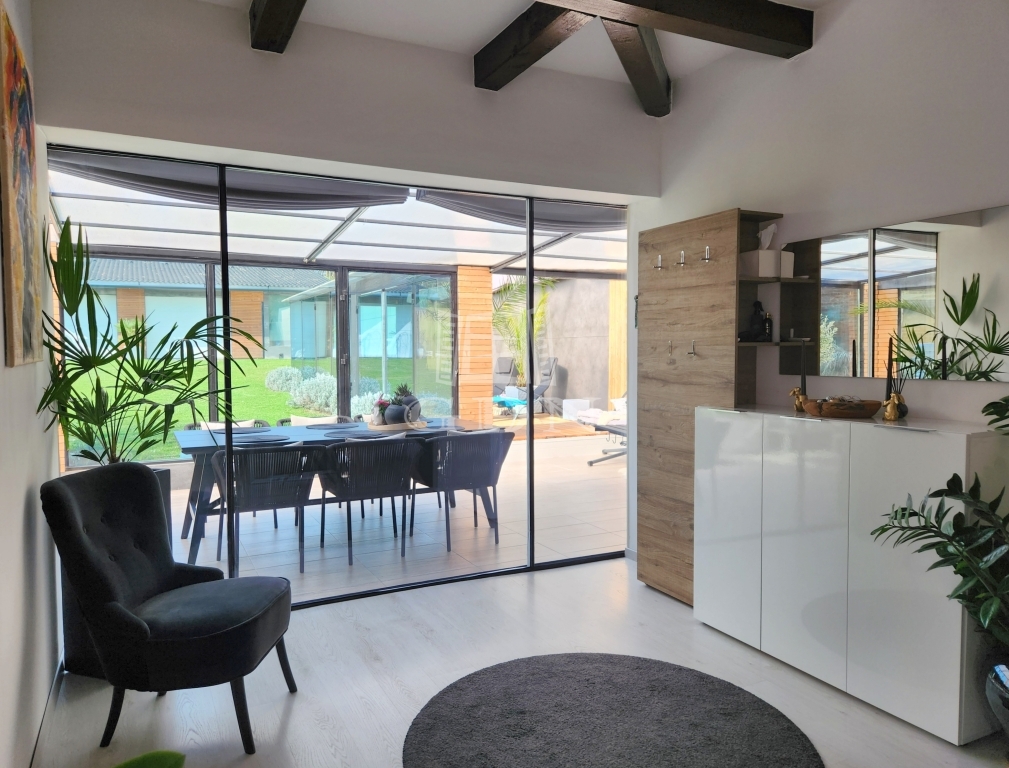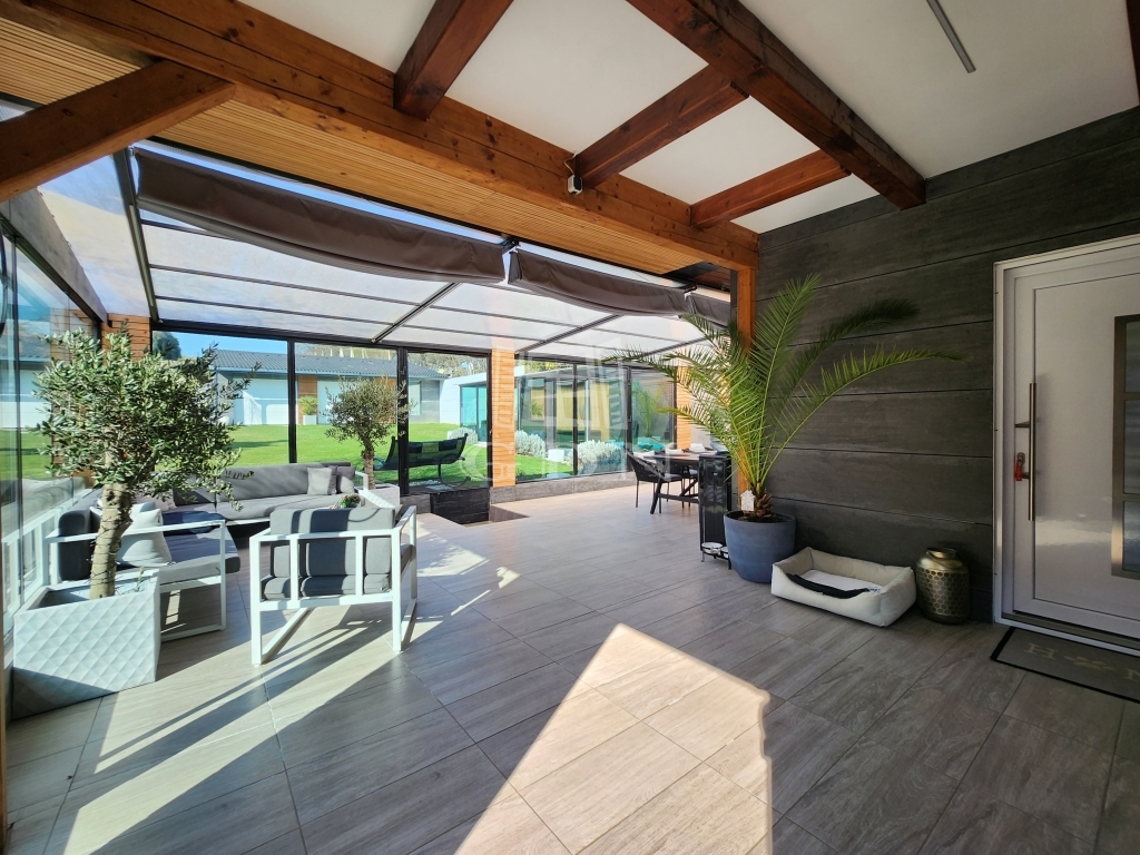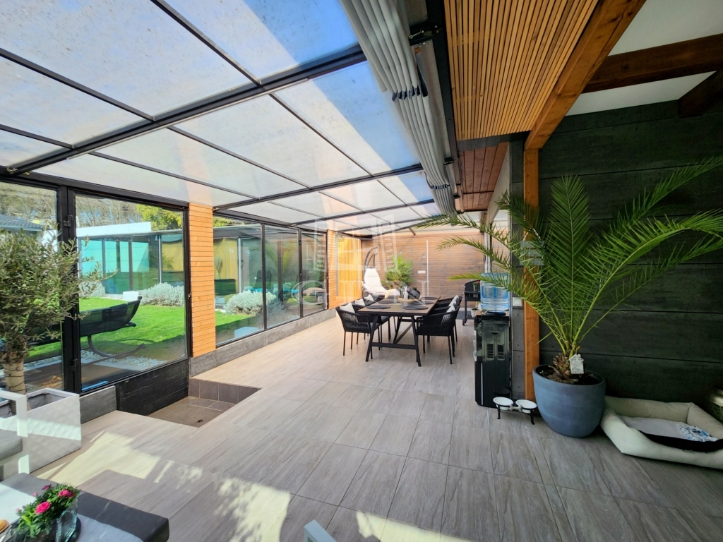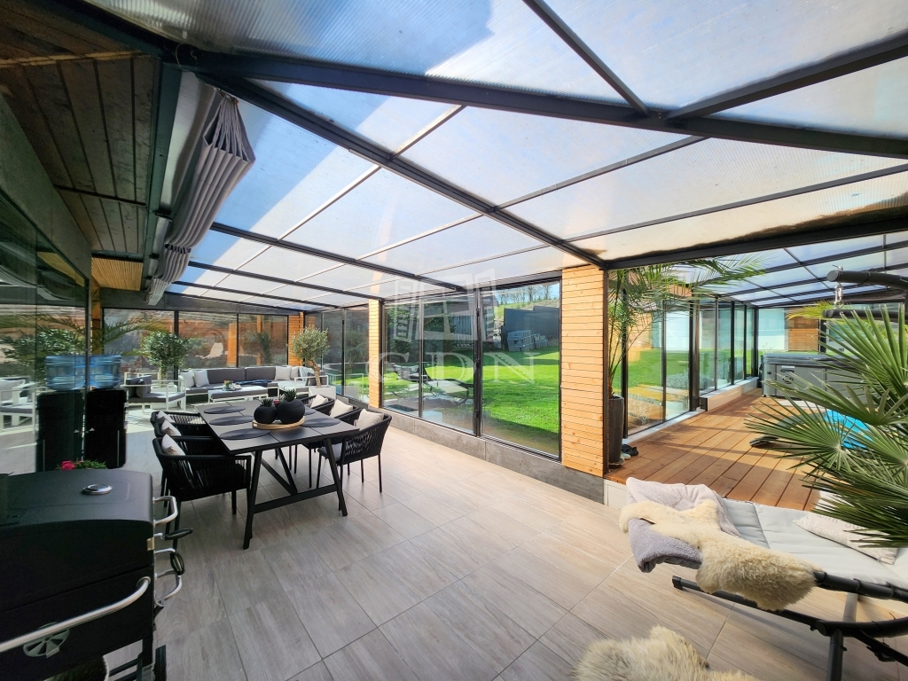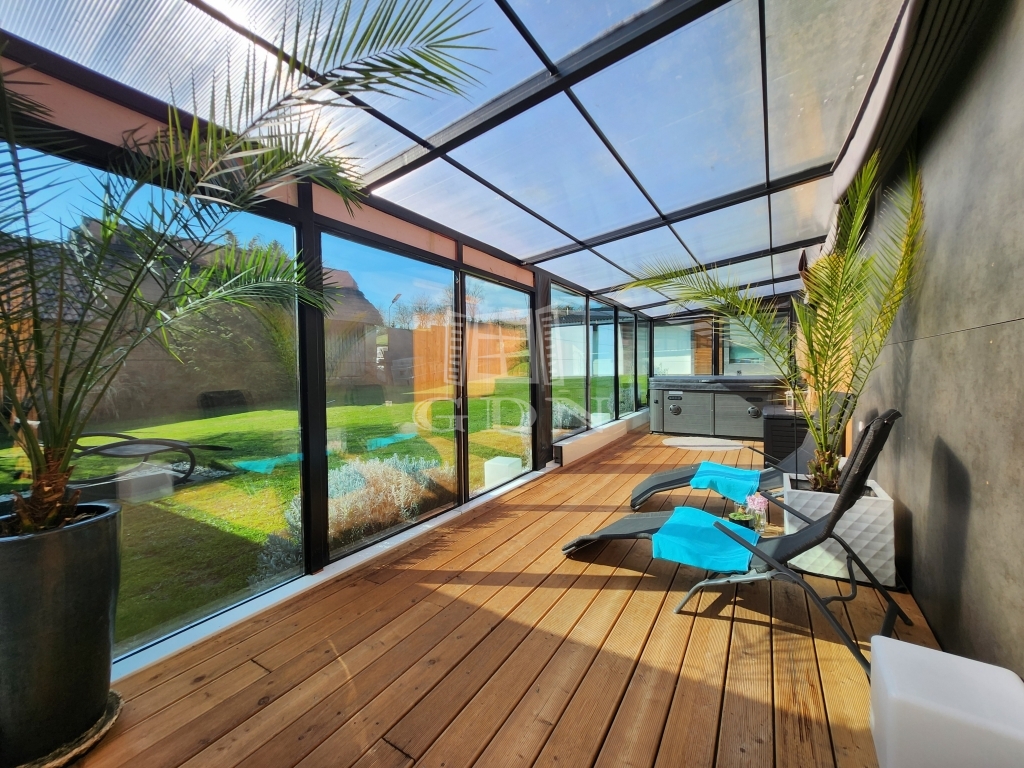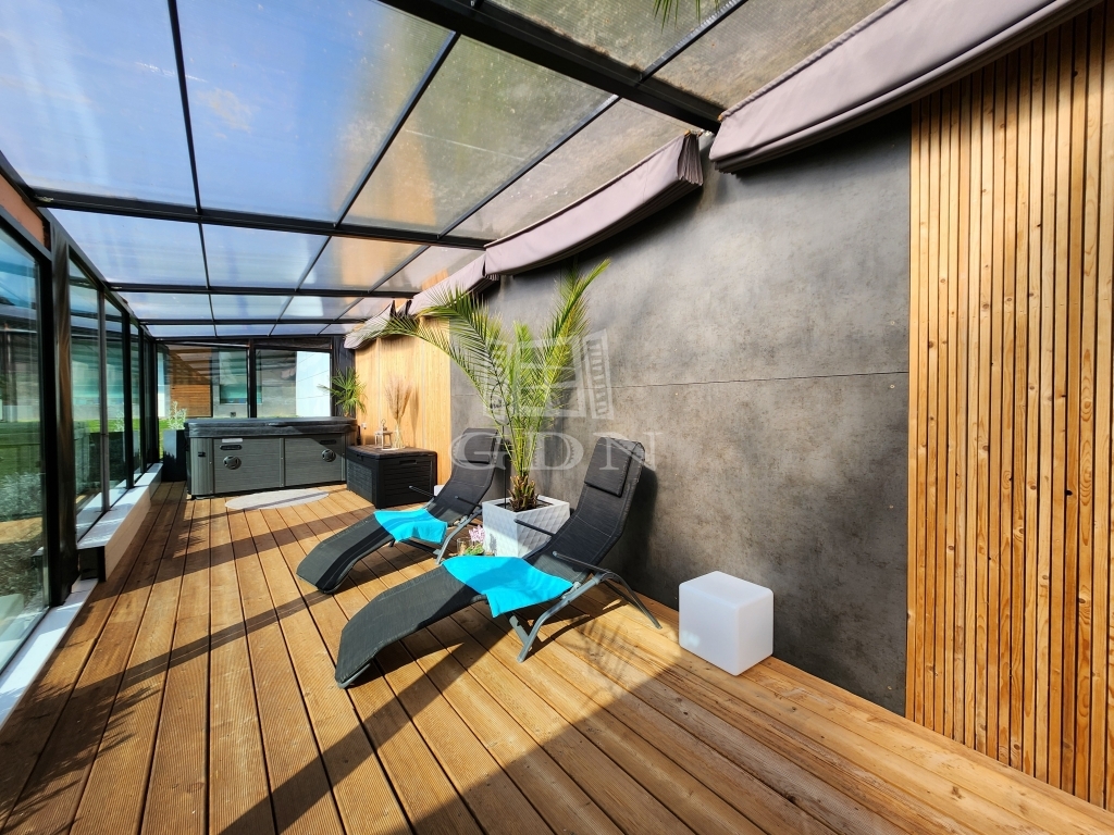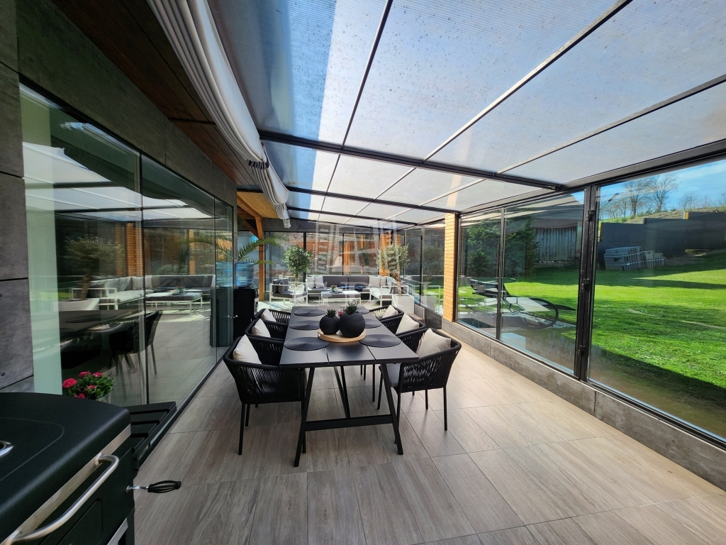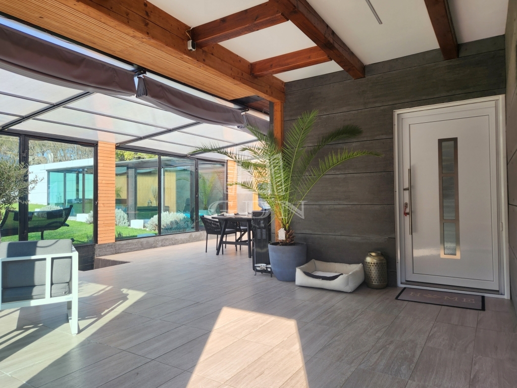 Csendes, árnyékolókkal ellátott 80 m2-es terasza pihenésre, családi összejövetelekre, kikapcsolódásra " született". Óriás üvegfelületei, kertre néző kilátása és a nyugalom, amely árad belőle, páratlan érzést képes nyújtani!
