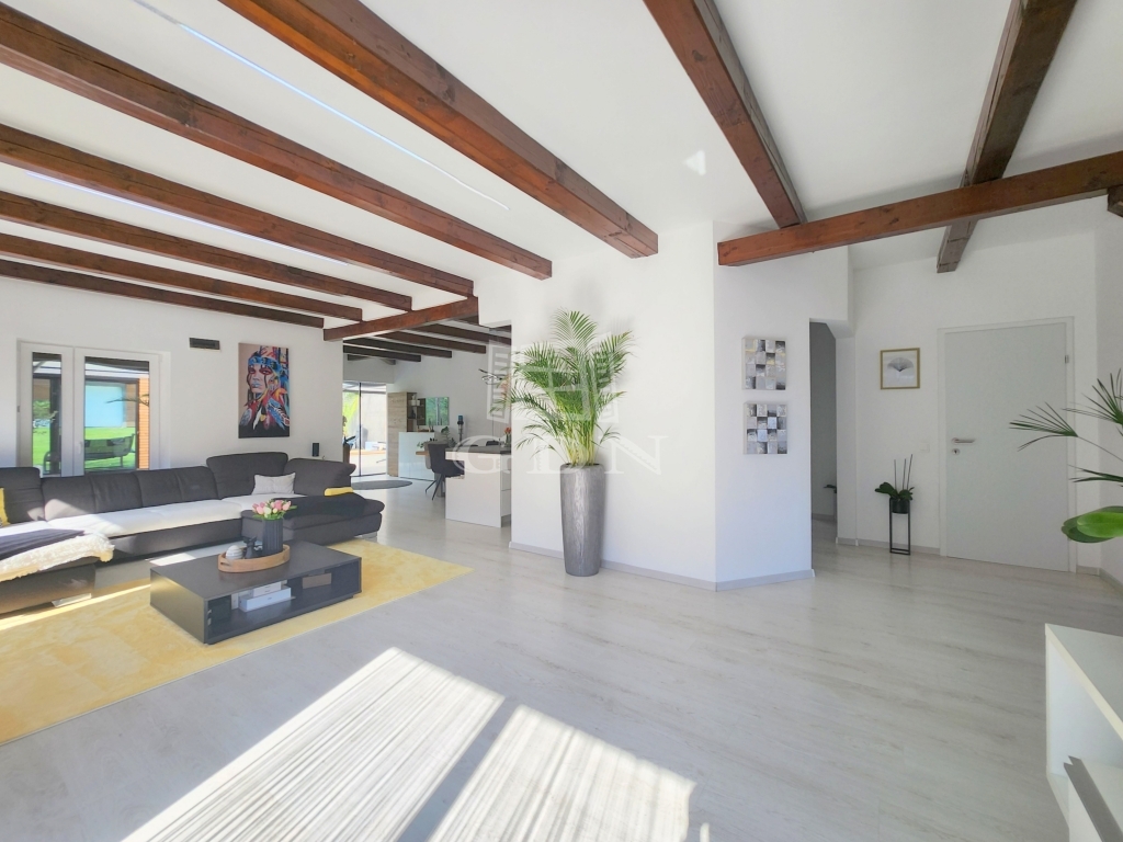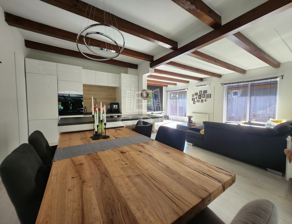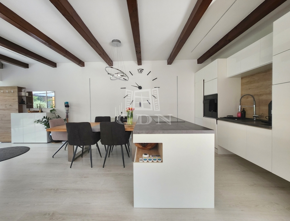 A fehér szín és letisztult arculat mellett karakteressé teszi a helyiségeket a szépen kezelt látszó gerenda, mely a homlokzaton és a teraszon használt fa borításokkal összhangban egy nyugodt, meleg érzést biztosít.