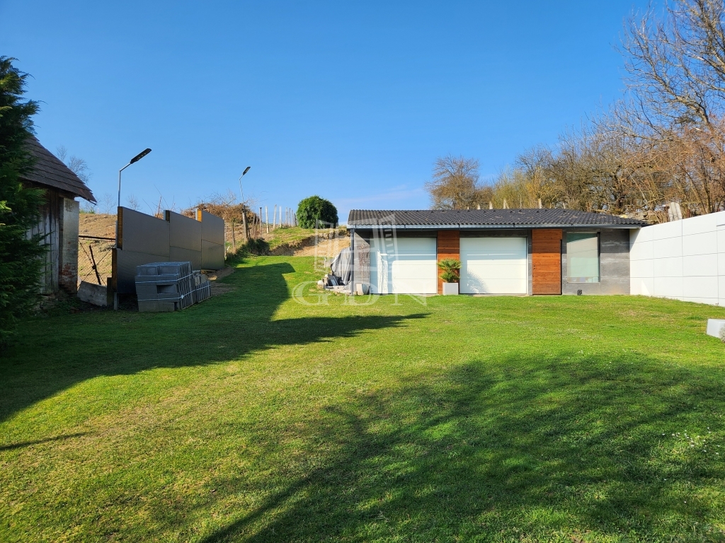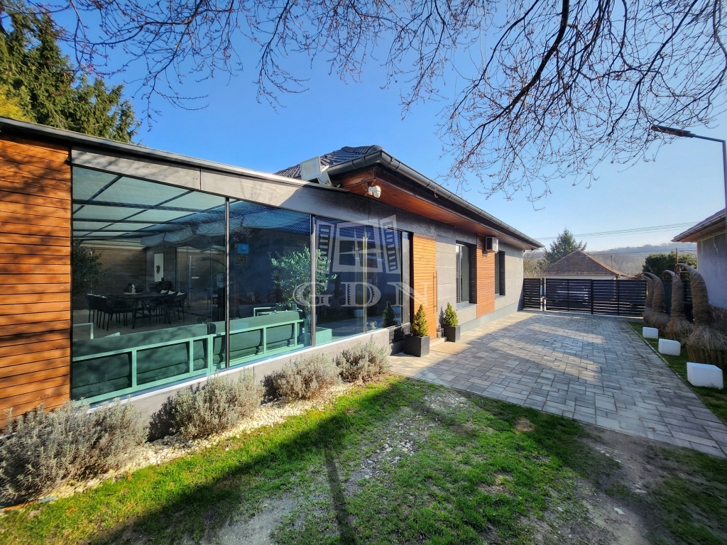 Az ingatlan 120 m2 nagyságú, nappali - konyha - étkező együttes és kettő háló kialakítású, 80 m2 terasszal, dupla garázzsal, melynek folytatása a panorámás 3539 m2 nagyságú birtok felső része.