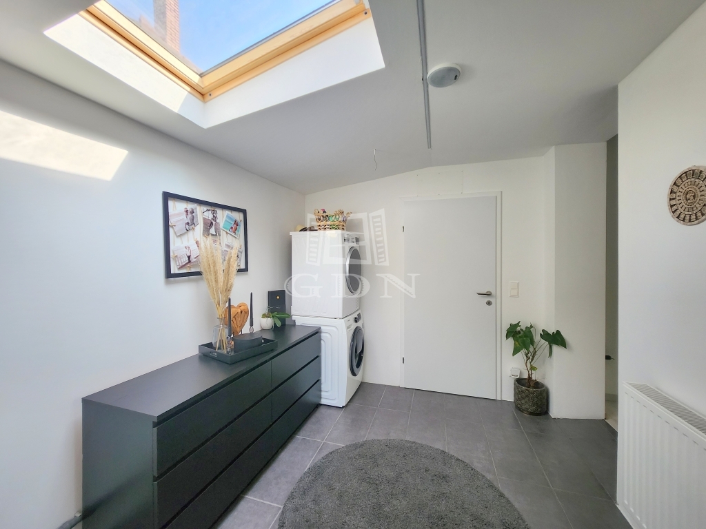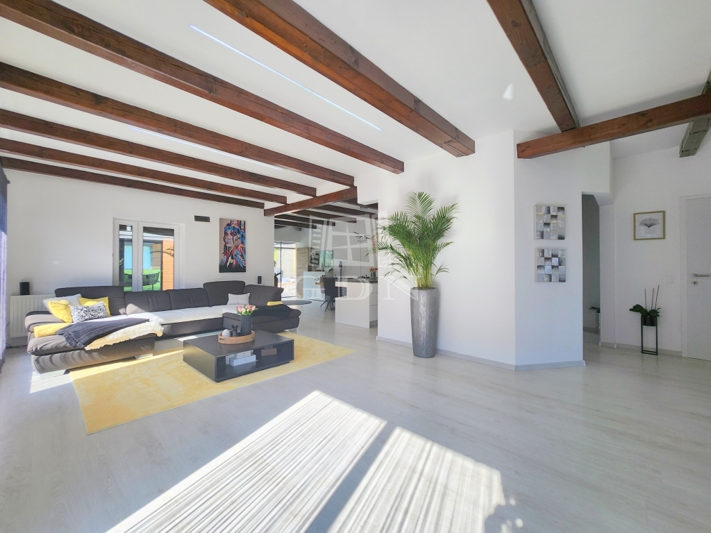 A családi ház központi része egy színeiben is minimalizmust hangsúlyozó, magas fényű fehér konyha felsőkategóriás eszközökkel, konyhaszigettel, valamint az ehhez szervesen kapcsolódó gyönyörű, 31 m2-es nappali, melyben szintén visszaköszön a letisztult, modern designnak megfelelő bútorzat.